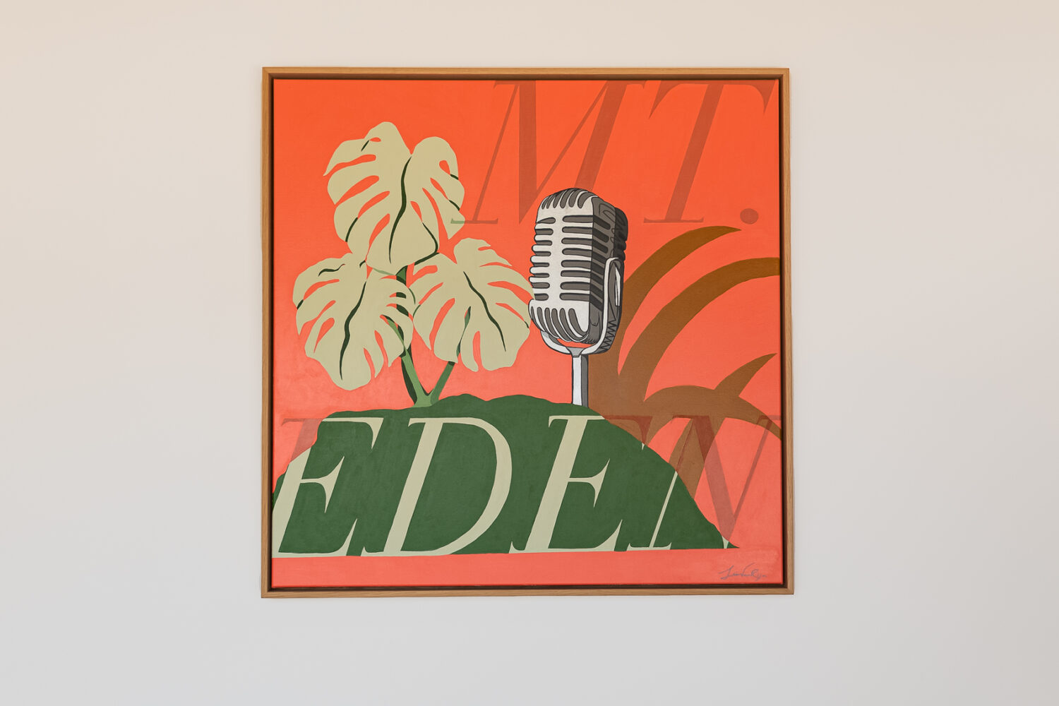This piece was created with an all-encompassing theme of Eden Park in mind. I wanted to capture Eden Park, not only as a stadium for sport, but also a landmark for the city and the diversity of other events that it hosts. The central microphone symbolises the platform that Eden Park acts as for local community and celebration of shared space. This is surrounded by natural foliage and the silhouette of Maungawhau (Mt Eden), capturing the pockets of nature that surround the park.
