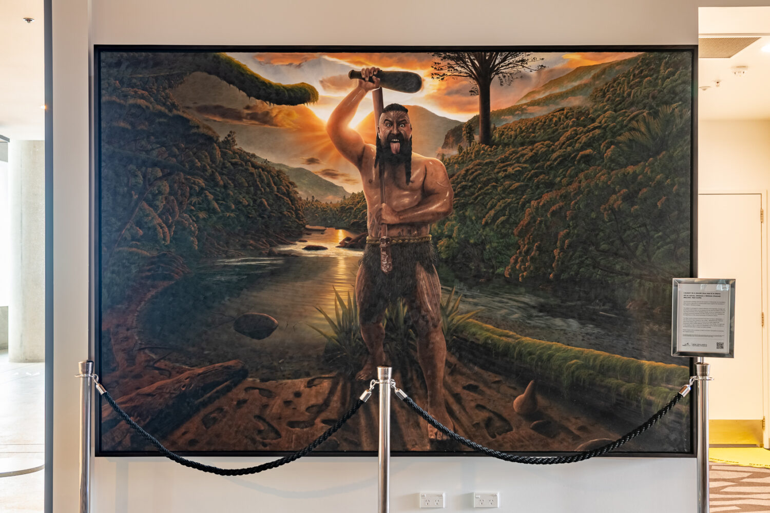 This evocative painting captures the essence of Wahaakiaki, the formidable Māori warrior, depicted in a resolute battle stance against the backdrop of the majestic Waitakere Ranges.