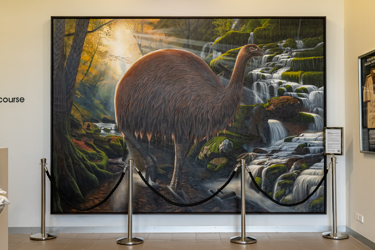 Standing at an impressive 2 metres tall, this life-sized painting of the giant Moa is a world-first, offering the unique opportunity to stand in the awe-inspiring presence of this magnificent bird. The painting captures the essence of the Moa by depicting its distinctive features and remarkable stature.
