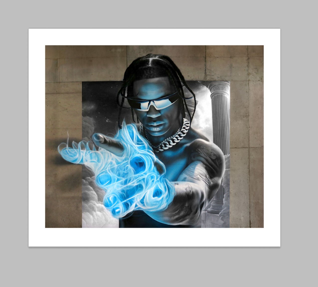 Matt’s vision was to capture the spirit of the tour and Travis Scott’s larger-than-life presence as both a creator and visionary. The mural features Travis with his hand extended, engulfed in vibrant blue flames—an homage to his nickname, La Flame, a force of innovation and change. The flames, akin to a superhuman power, symbolise his relentless drive to push the boundaries of art and culture. His intense gaze, framed by futuristic shades, communicates not just confidence, but a focus on shaping the future.